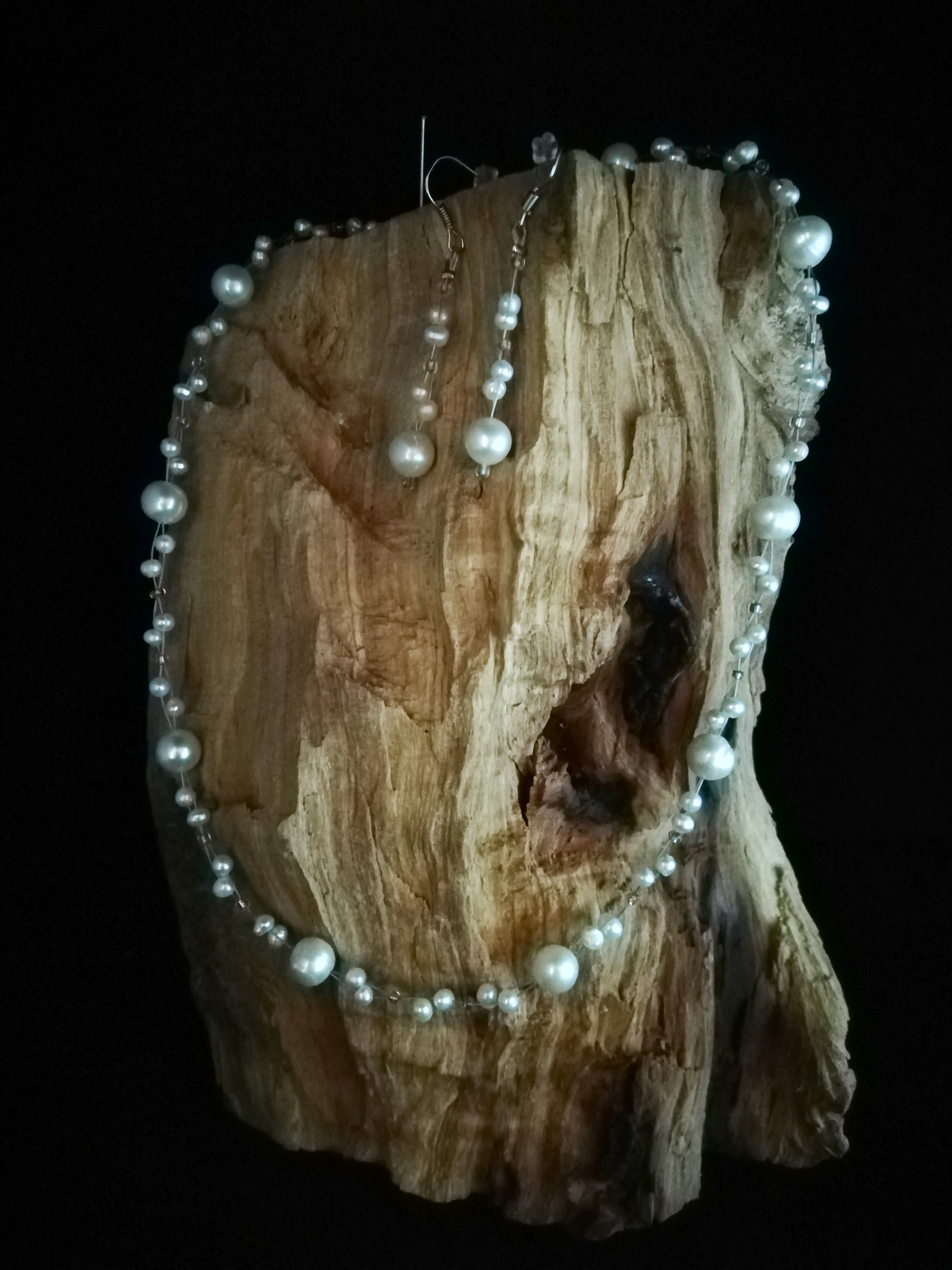 Kerek apró és nagy szemű tenyésztett gyöngy és átlátszó üveggyöngy lánc és fülbevaló.