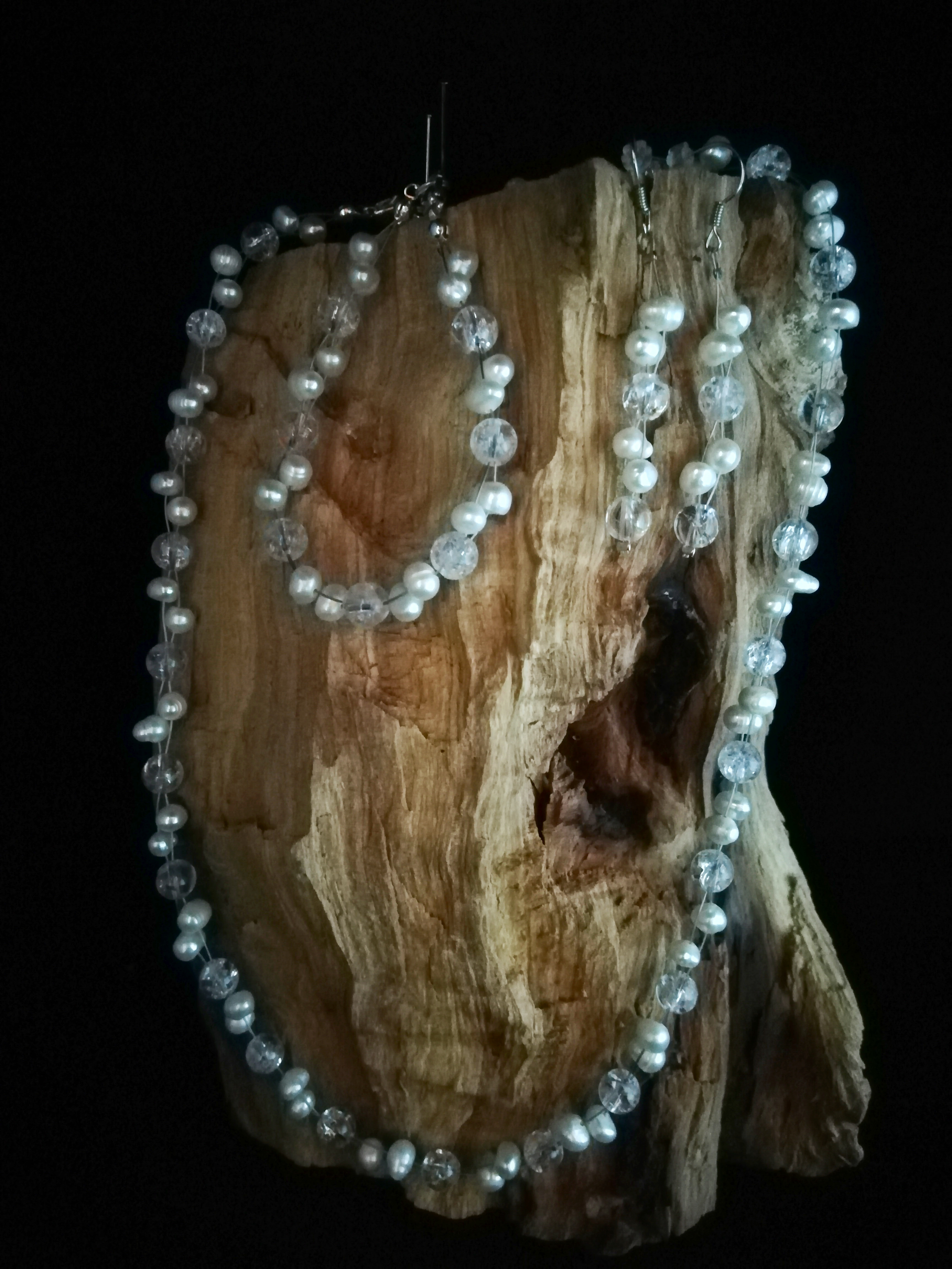Kerekded, fehér színű tenyésztett gyöngy és kerek robbantott hegyikrstály lánc , karkötő és fülbevaló.