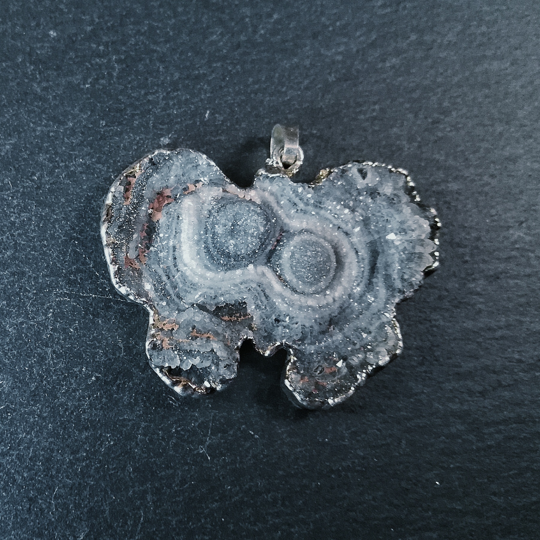 Kalcedon medál ezüst színű fémötvözettel futtatva.