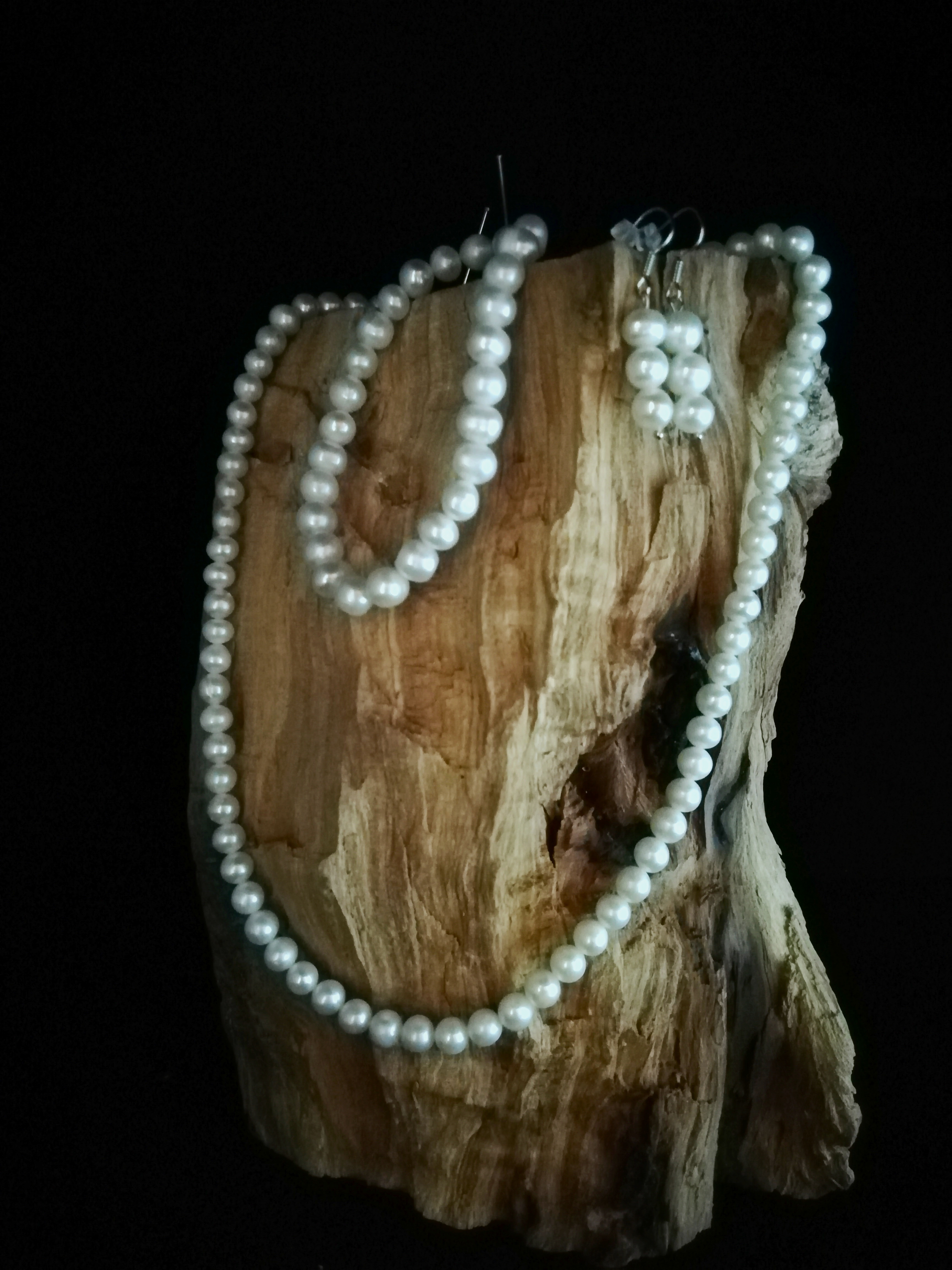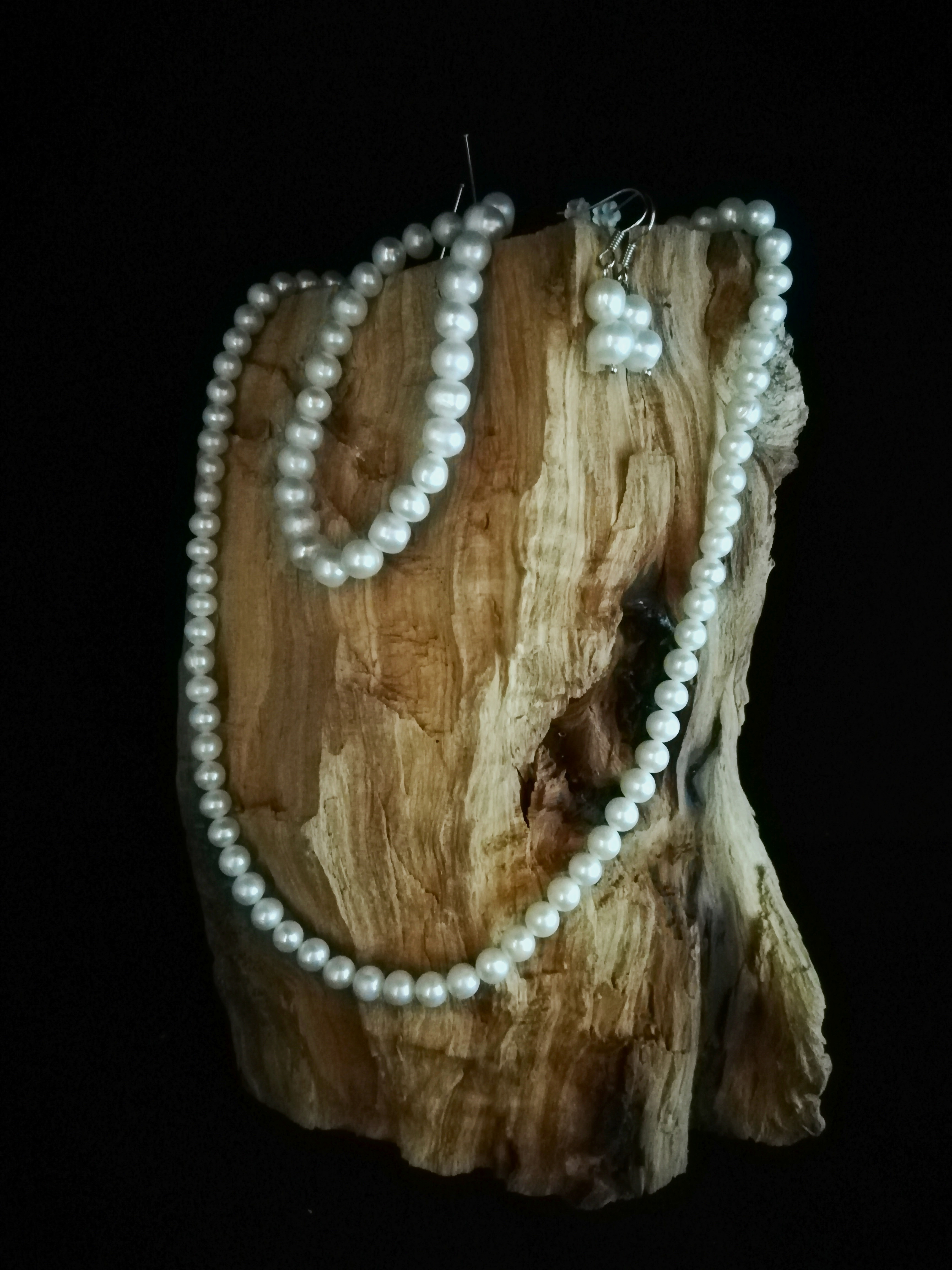 Kerek formájú fehér színű tenyészett gyöngy lánc, karkötő és választható hosszúságú fülbevaló.