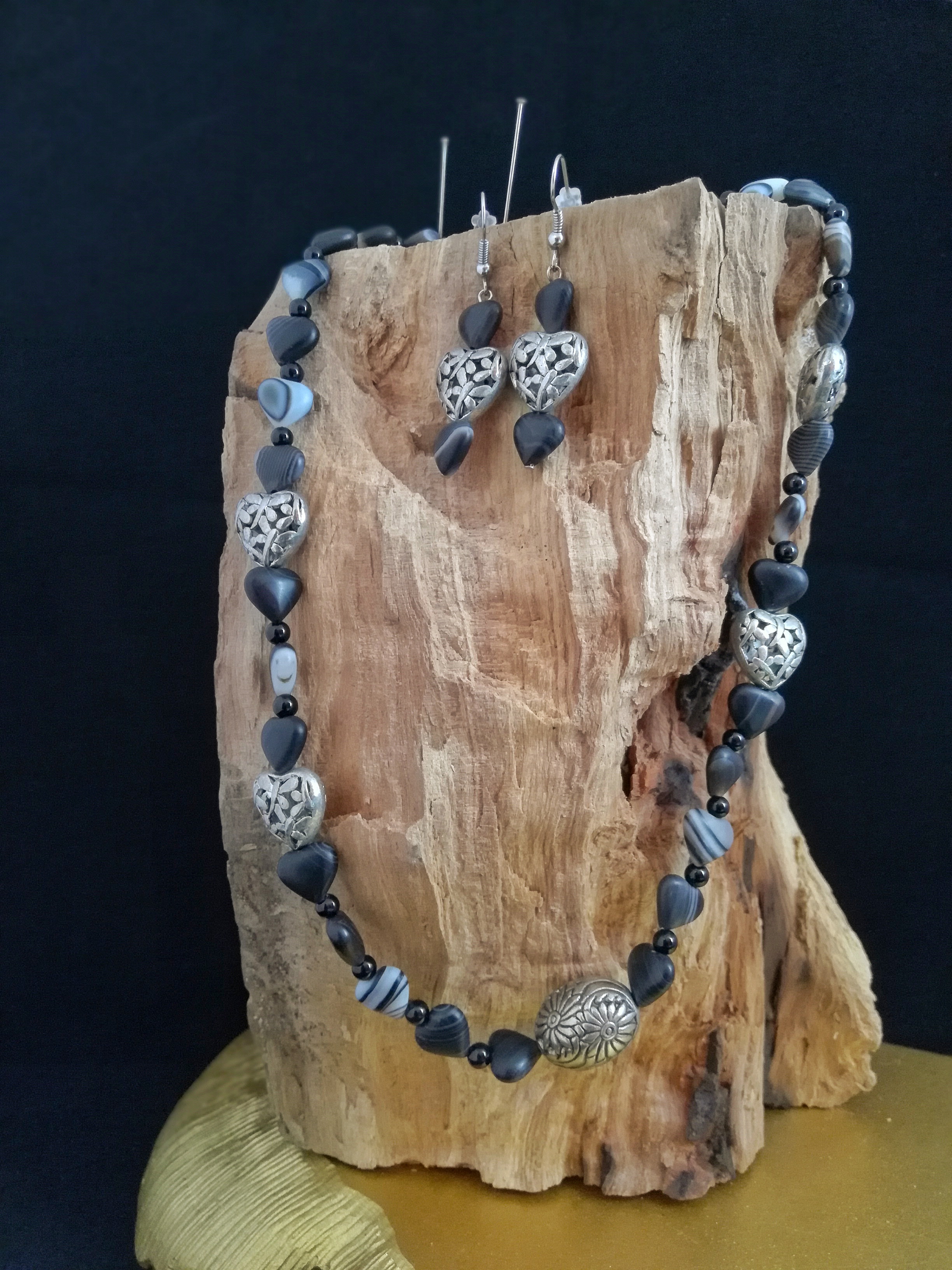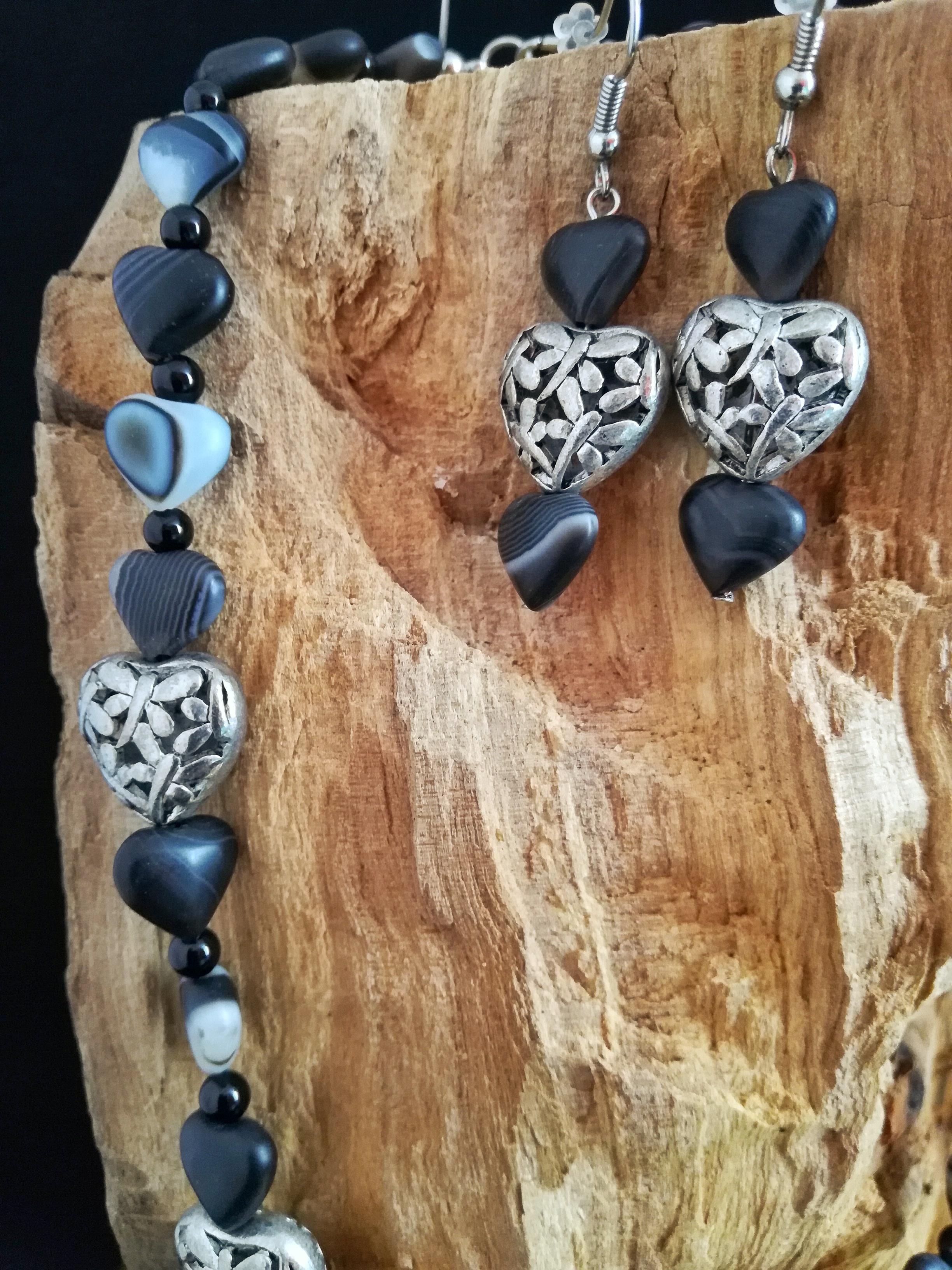 Matt ónix szív, fényes apró ónixokkal lánc és fülbevaló mennyiség