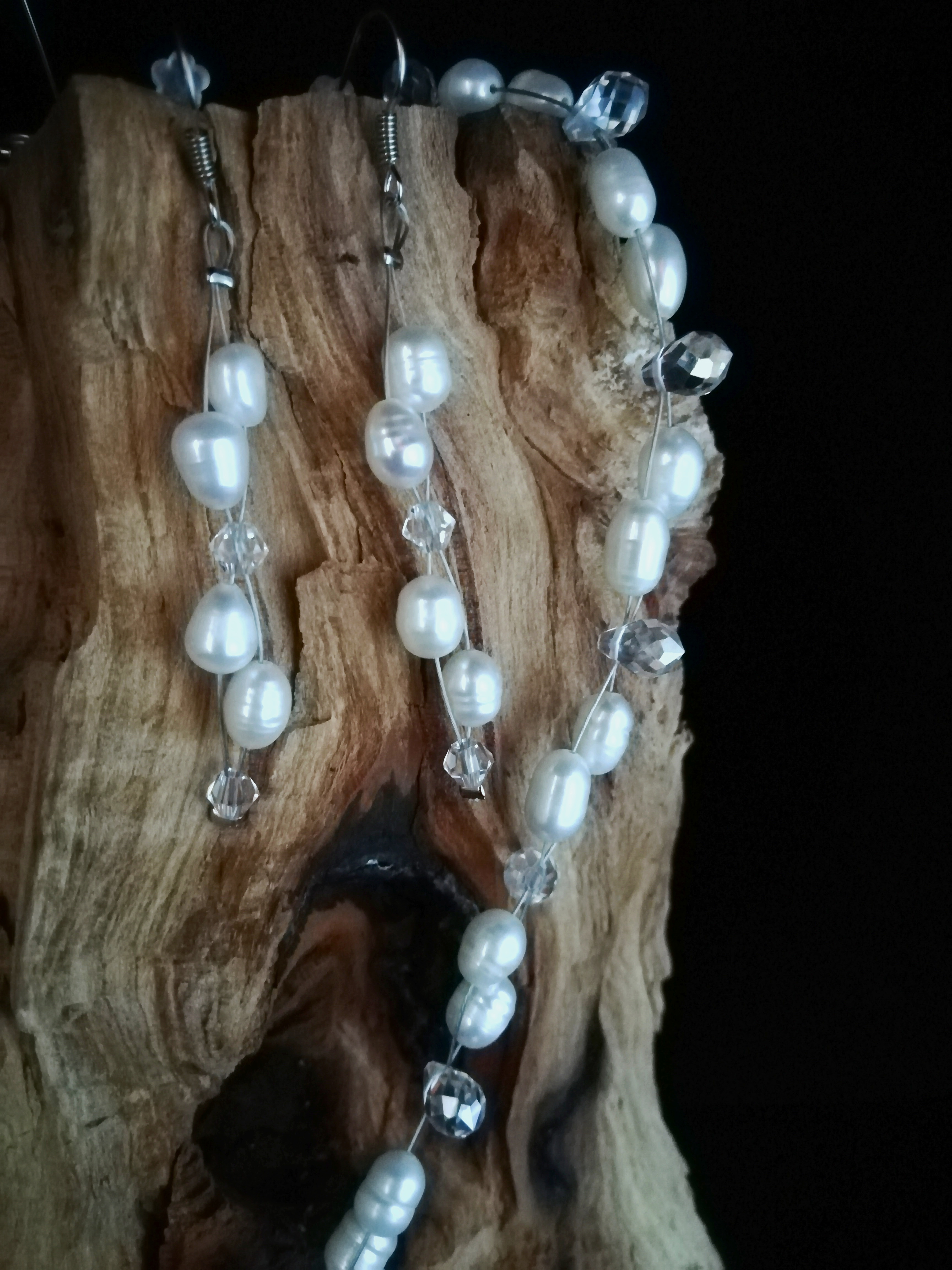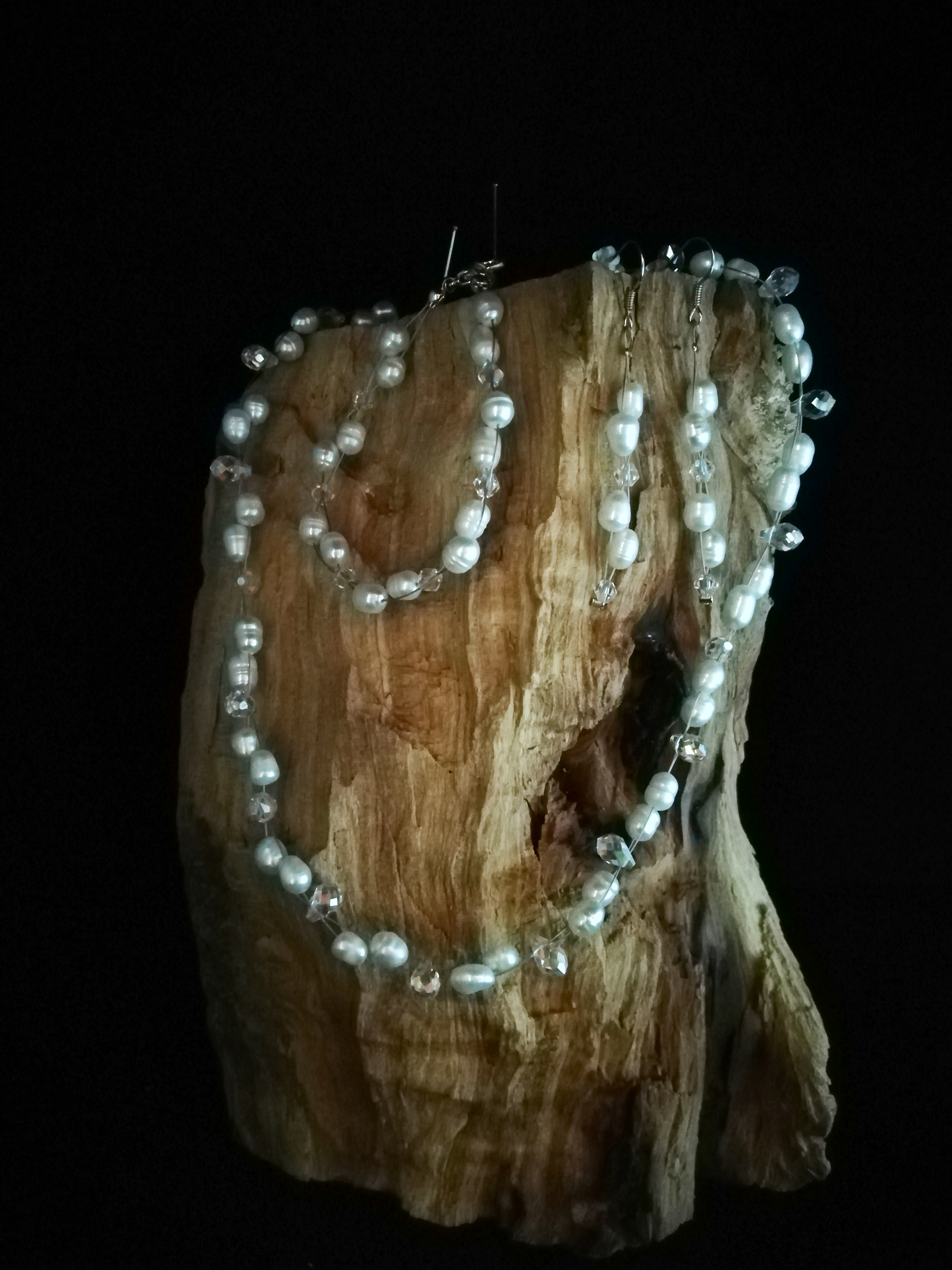Ovális fehér tenyésztett gyöngy és átlátszó csehkristály lánc, karkötő és fülbevaló.