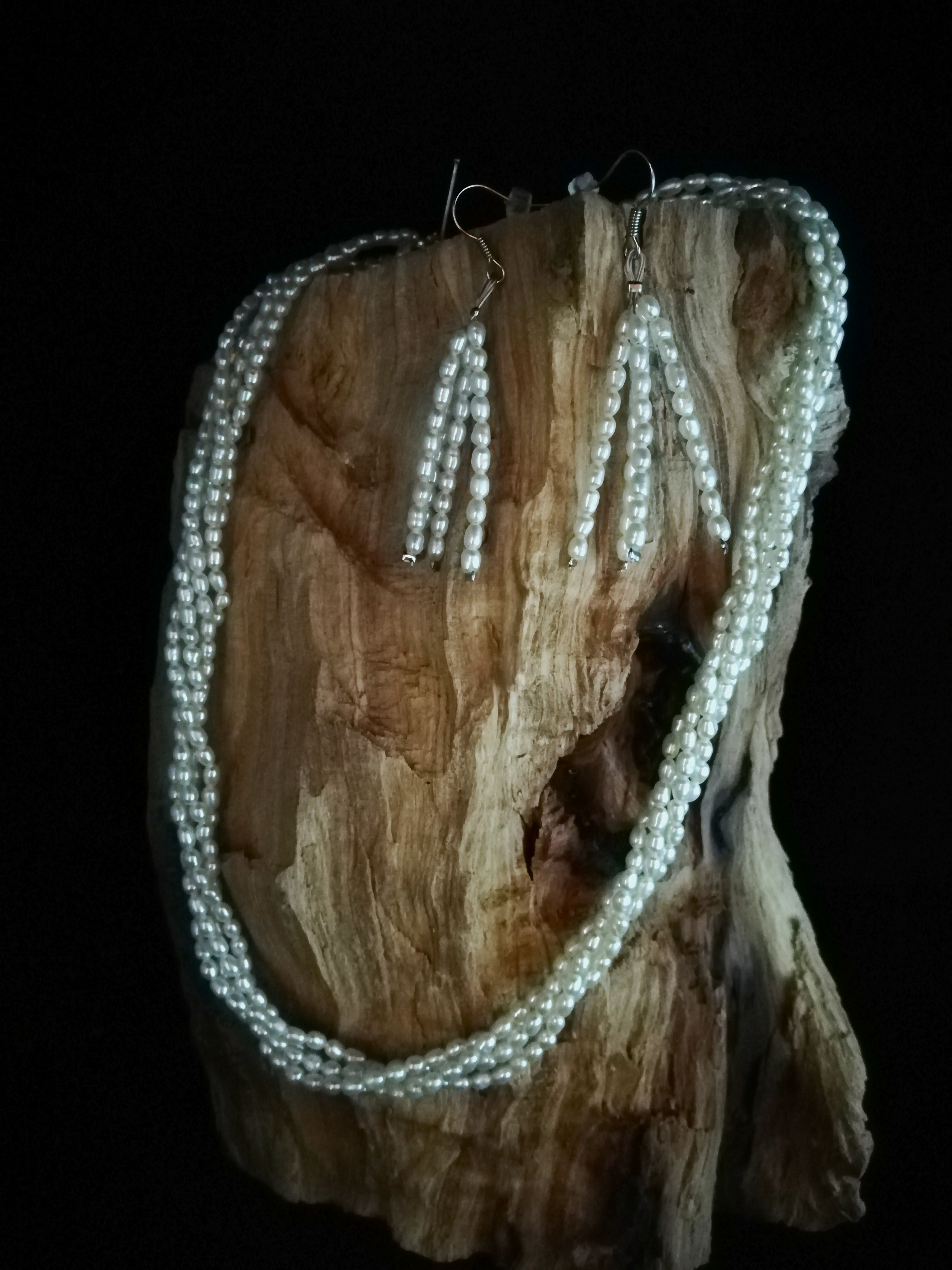 Apró, fehér rizsszem tenyésztett gyöngy 4 soros csavart lánc és fülbevaló.